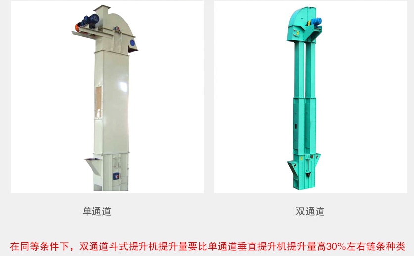環(huán)鏈斗式提升機(jī)分為單通道和雙通道兩種,雙通道主要是加強(qiáng)整機(jī)的中間節(jié)強(qiáng)度,提升量會(huì)高出30%左右,一般的單通道斗式提升機(jī)是料斗的上行和下行都是在一個(gè)機(jī)殼通道內(nèi),價(jià)格會(huì)比雙通道斗式提升機(jī)更便宜。