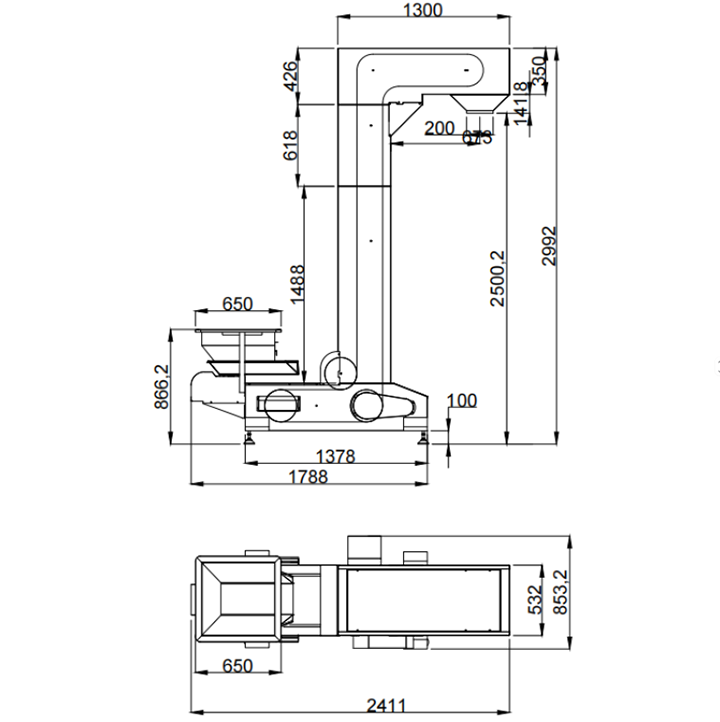 鏈條式Z型輸送機通常配備板鏈或附件鏈條,較高的承載能力和抗沖擊性能。輸送高度范圍可達2-15米以上,常用鏈條寬度為300–600mm,載重能力可達2t/h以上,適用于生產(chǎn)線負荷大、袋體較重或大容量液體袋的液體包裝場景。